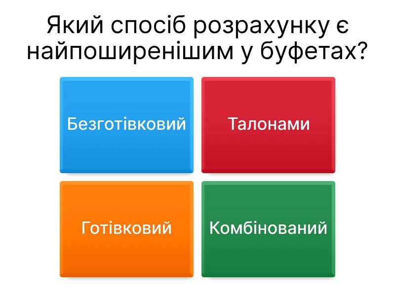 1) Який спосіб розрахунку є найпоширенішим у буфетах? a) Безготівковий b) Талонами c) Готівковий d) Комбінований 2) Чим здійснюється безготівковий розрахунок? a) Тільки банківськими картками b) Картками, смартфонами та смартгодинниками c) Лише талонами d) Монетами 3) Що обов’язково має видати буфетник при продажу продукції через касовий апарат? a) Пакет b) Список товарів c) Чек d) Калькуляцію 4) У яких закладах найчастіше застосовують розрахунок талонами або відомістю? a) У ресторанах b) У школах та на підприємствах c) У кафе d) У супермаркетах 5) Що таке комбінований платіж? a) Оплата лише готівкою b) Оплата двома різними видами (готівкою і карткою) c) Оплата талонами d) Попередня оплата 6) Який із способів розрахунку залежить від роботи інтернету? a) Готівковий b) Розрахунок талонами c) Безготівковий d) Ваговий 7) Який документ підтверджує попередню оплату за харчування? a) Чек b) Термінальний звіт c) Талон d) Меню 8) Що повинен робити буфетник під час готівкового розрахунку? a) Відмовляти у здачі b) Видавати чек і здачу c) Записувати всі купюри d) Перераховувати товар кожному покупцю 9) Який спосіб розрахунку застосовується при корпоративних замовленнях? a) Комбінований b) Попередня оплата c) Готівковий d) Талонами 10) Що забезпечує правильна організація розрахунків у буфеті? a) Лише економію часу b) Лише зручність для персоналу c) Точність обліку, швидкість і задоволення споживачів d) Можливість збільшити ціни