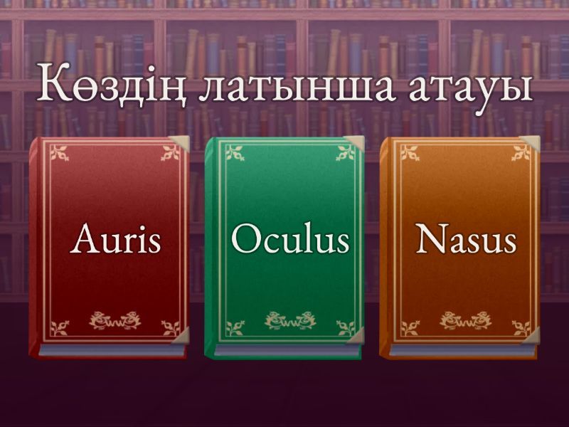 1) Көздің латынша атауы a) Auris b) Oculus c) Nasus 2) Көздің ақ қабығы a) Склера b) Тор қабық c) Қасаң қабық 3) Жарықты өткізетін қабық a) Нұрлы қабық b) Қасаң қабық c) Склера 4) Көздің түсін анықтайтын қабық a) Тор қабық b) Тамырлы қабық c) Нұрлы қабық 5) Жарық мөлшерін реттейтін бөлік a) Көз бұршағы b) Қарашық c) Көз сұйықтығы 6) Жарықты қабылдайтын ішкі қабық a) Торлы қабық b) Тамырлы қабық c) Склера 7) Торлы қабықтың ең анық көретін орталық бөлігі a) Қарашық b) Соқыр дақ c) Сары дақ 8) Көру ақпаратын миға жеткізетін жүйке a) Бет жүйкесі b) Үшкіл жүйке c) Көру жүйкесі 9) Көз алмасын қозғалтатын құрылымдар a) Байламдар b) Көз бұлшықеттері c) Қабақтар 10) Көзді ылғалдандырып, тазалайтын сұйықтық a) Жас b) Көз сұйықтығы c) Қан 11) Жас бөлетін мүше a) Қабақ b) Кірпік c) Жас безі 12) Көз алмасының пішінін сақтап тұратын зат a) Көз сұйықтығы b) Шыны тәрізді дене c) Көз бұршағы 13) Көзді терден,судан қорғайтын қосымша мүше a) Қас b) Кірпік c) Қабақ 14) Қабақтың латынша атауы a) cilia b) palbebrae c) supercilium 15) Кірпіктің атқаратын қызметі a) шаңнан қорғау b) терден қорғау c) жарықтан қорғау