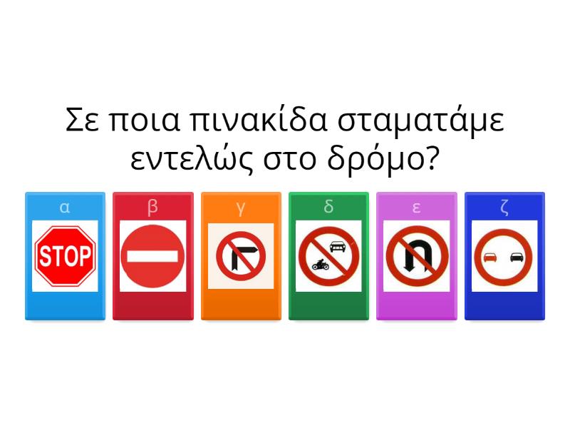 1) Σε ποια πινακίδα σταματάμε εντελώς στο δρόμο? a) b) c) d) e) f) 2) Επιτρεπονται τα ποδηλατα a) b) c) d) e) f) 3) Δεν επιτρεπεται να στριψουμε δεξια a) b) c) d) e) f) 4) Απαγορεύεται η υπέρβαση του ορίου της ταχύτητας 50 χιλιόμετρα την ώρα  a) b) c) d) e) f) 5) Οι πεζοί μπορούν να διασχίσουν τον δρόμο με ασφάλεια. a) b) c) d) e) f) 6) Εκει περα παρκαρουν μονο τα ΤΑΞΙ a) b) c) d) e) f) 7) Δεν επιτρεπονται τα λεωφορια a) b) c) d) e) f) 8) Απαγορευεται να παρκαρουμε σε αυτο το σημειο a) b) c) d) e) f) 9) Επιτρεπεται να προχωρισουμε ευθια και να στριψουμε αριστερα. a) b) c) d) e) f) 10) Επιτρεπονται τα αλογα. a) b) c) d) e) f)