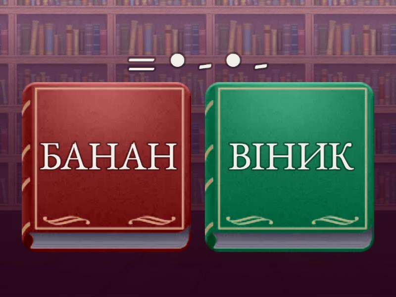 1) = • - • - a) БАНАН b) ВІНИК 2) = • - - a) ПИРІГ b) ЛІФТ 3) • - • - a) ІВАН b) ПОЛЕ 4) = • - • a) САША b) ЛІЗА 5) - • = • - a) ПОХІД b) КІНО 6) - • - • - • - a) МАШИНА b) ТЕЛЕФОН 7) - • - • = • - • - a) ТЕЛЕВІЗОР b) МІКРОБ 8) - - • = • a) СТІНА b) ДВЕРІ 9) = • - • = • - • a) ВИНОГРАД b) ВІТАМІНИ 10) - - • - • a) СЛИВА b) СМІХ