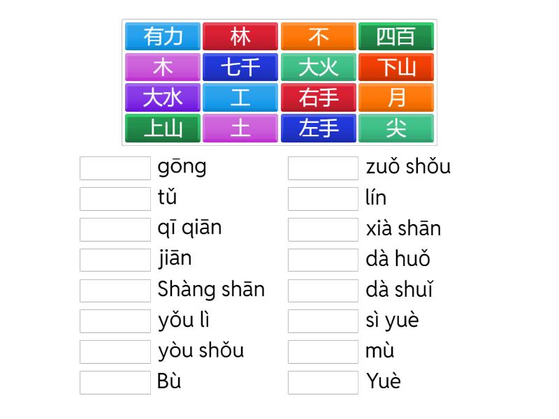 上山 - Shàng shān , 大火 - dà huǒ , 下山 - xià shān  , 大水 - dà shuǐ, 月 - Yuè , 尖 - jiān, 有力 - yǒu lì , 左手 - zuǒ shǒu, 右手 - yòu shǒu, 不 - Bù , 林 - lín, 木 - mù , 土 - tǔ, 工 - gōng , 四百 - sì yuè , 七千 - qī qiān,