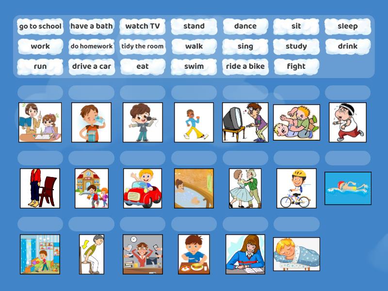 drink , eat, have a bath , sleep, fight , run, watch TV , sit, dance, walk, stand , swim , drive a car , do homework , ride a bike , sing , study , go to school , work, tidy the room,