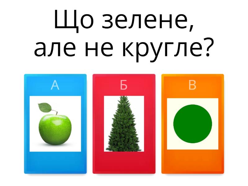 1) Що зелене, але не кругле? a) b) c) 2) Що жовте, але не солодке? a) b) c) 3) Що синє, але не кругле?  a) b) c) 4) Що помаранчеве, але не фігура?  a) b) c) 5) Що червоне, але не овоч? a) b) c) 6) Що зелене, але не гостре? a) b) c)