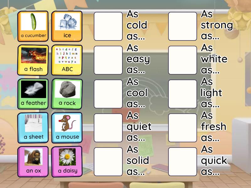 a mouse - As quiet as..., a flash - As quick as..., ice - As cold as..., a daisy - As fresh as..., a feather - As light as..., ABC - As easy as... , a rock - As solid as..., an ox - As strong as..., a sheet - As white as..., a cucumber - As cool as...,