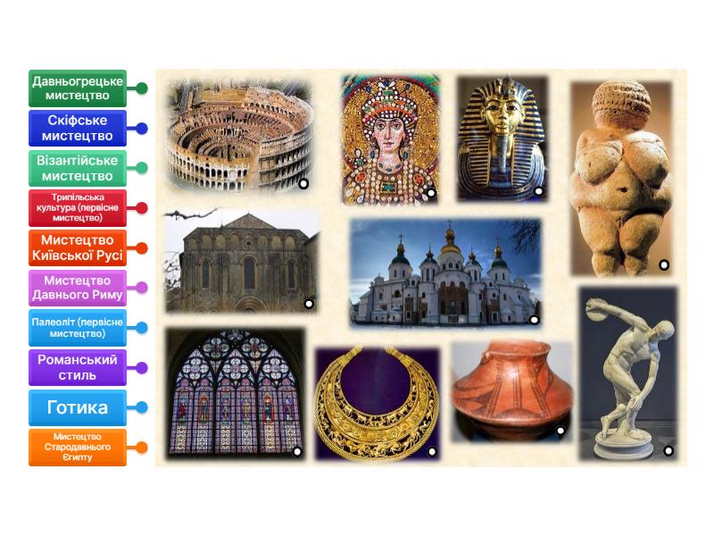Палеоліт (первісне мистецтво), Трипільська культура (первісне мистецтво), Мистецтво Стародавнього Єгипту, Давньогрецьке мистецтво, Мистецтво Давнього Риму, Скіфське мистецтво, Візантійське мистецтво, Мистецтво Київської Русі, Романський стиль, Готика.