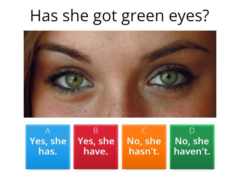 1) Has she got green eyes? a) Yes, she has. b) Yes, she have. c) No, she hasn't. d) No, she haven't. 2) Have they got blond hair? a) Yes, they has. b) Yes, they have. c) No, they hasn't. d) No, they haven't. 3) Has he got a school bag? a) Yes, he has. b) Yes, he have. c) No, he hasn't. d) No, he haven't. 4) Have they got small eyes? a) Yes, they has. b) Yes, they have. c) No, they hasn't. d) No, they haven't. 5) Have you got purple eyes? a) Yes, I has. b) Yes, I have. c) No, I hasn't. d) No, I haven't. 6) Has she got a book? a) Yes, she has. b) Yes, she have. c) No, she hasn't. d) No, she haven't. 7) Has it got windows? a) Yes, it has. b) Yes, it have. c) No, it hasn't. d) No, it haven't. 8) Has he got a garden? a) Yes, he has. b) Yes, he have. c) No, he hasn't. d) No, he haven't. 9) Have you got teeth? a) Yes, I has. b) Yes, I have. c) No, I hasn't. d) No, I haven't. 10) Has she got a ruler? a) Yes, she has. b) Yes, she have. c) No, she hasn't. d) No, she haven't. 11) Have they got mobile phones? a) Yes, they has. b) Yes, they have. c) No, they hasn't. d) No, they haven't. 12) Has it got a shirt? a) Yes, it has. b) Yes, it have. c) No, it hasn't. d) No, it haven't.