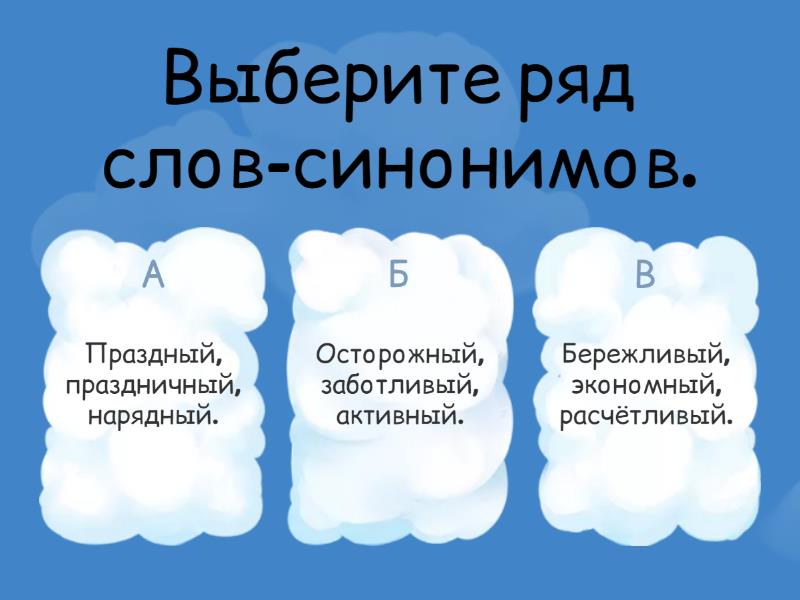 1) Выберите ряд слов-синонимов. a) Осторожный, заботливый, активный. b) Бережливый, экономный, расчётливый. c) Праздный, праздничный, нарядный. 2) Выберите ряд антонимов a) писать - рисовать b) смотреть - видеть c) встречать - провожать 3) определите словосочетание с омонимом слова "побег" (бежать) a) побег яблони b) побег тыквы c) побег из тюрьмы 4) определите словосочетание с омонимом слова "правая" (сторона) a) правая стена b) правая рука c) правое дело 5) выберите ряд антонимов a) алый - красный b) сильный - слабый c) быстрый - торопливый 6) подберите синоним к слову "апатия" a) вялость b) подобие c) влияние 7) подберите синоним к слову "редкий" a) безупречный b) диковинный c) изящный 8) определите пару омонимов a) утренняя заря - заря свободы b) десятичная дробь - барабанная дробь c) мраморная доска - школьная доска 9) определите строку с омонимом слова "лицо" (внешность) a) красивое лицо b) приятное лицо c) изменение глаголов по лицам 10) подберите синоним к слову "малыш" a) взрослый b) ребенок c) человек