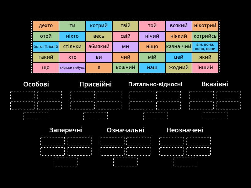 Особові: я, ми, ти, ви, він, вона, воно, вони, Присвійні: мій, твій, свій, наш, його, її, їхній, Питально-відносні: хто, що, який, чий, котрий, Вказівні: той, цей, такий, стільки, отой, Заперечні: ніхто, ніщо, ніякий, нічий, нікотрий, Означальні: весь, всякий, кожний, жодний, інший, Неозначені: дехто, абиякий, казна-чий, котрийсь, скільки-небудь,