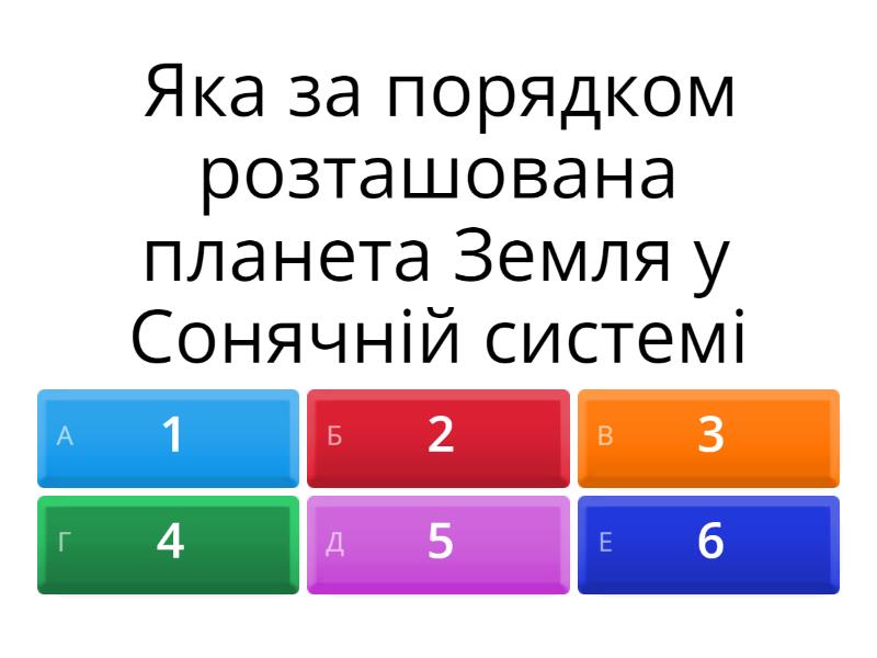 1) Яка за порядком розташована планета Земля у Сонячній системі a) 1 b) 2 c) 3 d) 4 e) 5 f) 6 2) Земля належить до планет якої групи: a) земної групи b) планети - карлики c) планети - гіганти d) газові гіганти 3) Вчений,який припустив, що земна куля виникла в результаті катастрофи. a) Іммануїл Кант b) П’єр Лаплас c) Жорж Бюффон d) Отто Шмідт 4) Який вчений вважав, що Сонце і планети виникли з гігантської розжареної газової хмари. a) Отто Шмідт b) П’єр Лаплас c) Іммануїл Кант d) Жорж Бюффон 5) На думку якого вченого Сонячна система утворилася з гігантської холодної пилоподібної хмари. a) Жорж Бюффон b) П’єр Лаплас c) Отто Шмідт d) Іммануїл Кант 6) Вчений ,який вважав, що мільярди років тому навколо Сонця була гігантська хмара з холодного пилу і замерзлого газу. a) Отто Шмідт b) П’єр Лаплас c) Іммануїл Кант d) Жорж Бюффон 7) Перші наукові уявлення про виникнення Землі з’явилися у: a) 15 ст b) 16 ст c) 17 ст d) 18 ст e) 19 ст f) 20 ст 8) Сучасні вчені припускають, що: a) Сонце і планети виникли з гігантської розжареної газової хмари,яка поступово остигала, стискалася і дала початок Сонцю та планетам b) Земля утворилась з розсіяної газово-пилової хмари, яка існувала в космічному просторі c) Сонце і планети виникли майже водночас з міжзоряної речовини - пилу і газу 9) Передбачення, припущення або міркування учених, які не доведені наукою - це: a) теорема b) закон c) правило d) гіпотеза 10) Вік нашої планети сягає : a) один мільярд років b) десять мільярдів років c) чотири з половиною мільярди років d) сім мільярдів років 11) В основі сучасних уявлень про походження Землі лежить гіпотеза: a) Іммануїла Канта b) П'єра Лапласа c) Отто Шмідта d) Жоржа Бюффона
