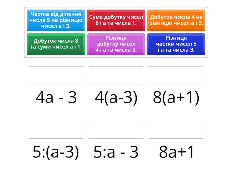 Добуток числа 4 на різницю чисел а і 3. - 4(а-3), Частка від ділення числа 5 на різницю чисел а і 3. - 5:(а-3), Сума добутку чисел 8 і а та числа 1. - 8а+1, Різниця частки чисел 5 і а та числа 3. - 5:а - 3, Добуток числа 8 та суми чисел а і 1. - 8(а+1), Різниця добутку чисел 4 і а та числа 3. - 4а - 3,