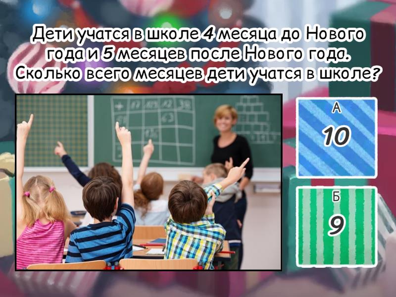 1) Дети учатся в школе 4 месяца до Нового года и 5 месяцев после Нового года. Сколько всего месяцев дети учатся в школе? a) 10 b) 9 2) В корзине было 12 снежков. Коля добавил ещё 5 снежков, а Маша взяла 4. Сколько снежков осталось в корзине? a) 13 b) 12 3) Три снеговика получили по 2 подарка каждый. Сколько всего подарков получили снеговики? a) 6 b) 8 4) На ёлке висит 10 шариков, 7 снежинок и 5 звёздочек. Мальчик повесил ещё 6 шариков. Сколько всего украшений стало на ёлке? a) 27 b) 28 5) В парке слепили 7 снеговиков, а потом ещё 3 снеговика. Но 2 снеговика растаяли на солнце. Сколько снеговиков осталось в парке? a) 7 b) 8