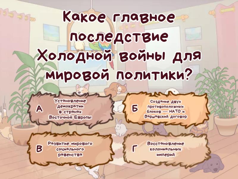 1) Какое главное последствие Холодной войны для мировой политики? a) Установление демократии в странах Восточной Европы b) Создание двух противоположных блоков — НАТО и Варшавский договор c) Развитие мирового социального равенства d) Восстановление колониальных империй 2) Какая страна стала основным правопреемником Советского Союза после его распада? a) украина b) россия c) беларусь d) казахстан 3) Какое событие символизировало окончание Холодной войны в Европе? a) Падение Берлинской стены b) Разделение Кореи на два государства c) Создание Европейского Союза d) Подписание Парижского мира 4) Какой был основной экономический эффект Холодной войны для Советского Союза? a) Экономический рост благодаря военным расходам b) Экономический кризис из-за гонки вооружений c) Устойчивое развитие экономики d) Привлечение иностранных инвестиций 5) Какие страны стали ареной прокси-войн в период Холодной войны? a) Только страны Европы b) Только страны Африки c) Развивающиеся страны Азии, Африки и Латинской Америки d) Только страны Северной Америки 6) Какие реформы проводились в Советском Союзе в конце Холодной войны? a) емократические реформы, направленные на восстановление монархии b) Экономические и политические реформы, известные как перестройка c) Введение строгих антикапиталистических мер d) Ликвидация социализма в пользу рыночной экономики 7) Что произошло с Восточной Европой после Холодной войны? a) Восточные страны стали коммунистическими b) Восточная Европа была оккупирована США c) В странах Восточной Европы произошел переход к демократии d) Все страны Восточной Европы объединились с СССР 8) Какие международные организации играли роль в стабилизации мира после Холодной войны? a) Лига Наций и Варшавский договор b) ООН и ОБСЕ c) Всемирный банк и Международный валютный фонд d) НАТО и ЕС