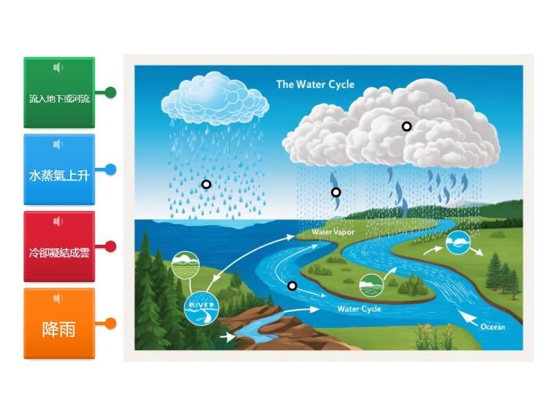 水蒸氣上升 , 冷卻凝結成雲 , 降雨 , 流入地下或河流 .