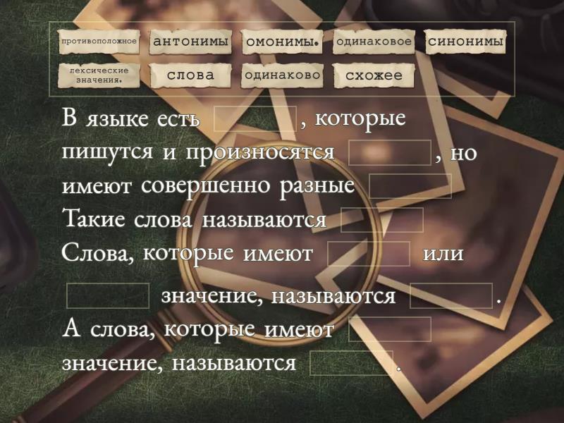 В языке есть ____, которые пишутся и произносятся ____, но имеют совершенно разные ____ Такие слова называются ____ Слова, которые имеют ____ или ____ значение, называются ____. А слова, которые имеют ____ значение, называются ____.