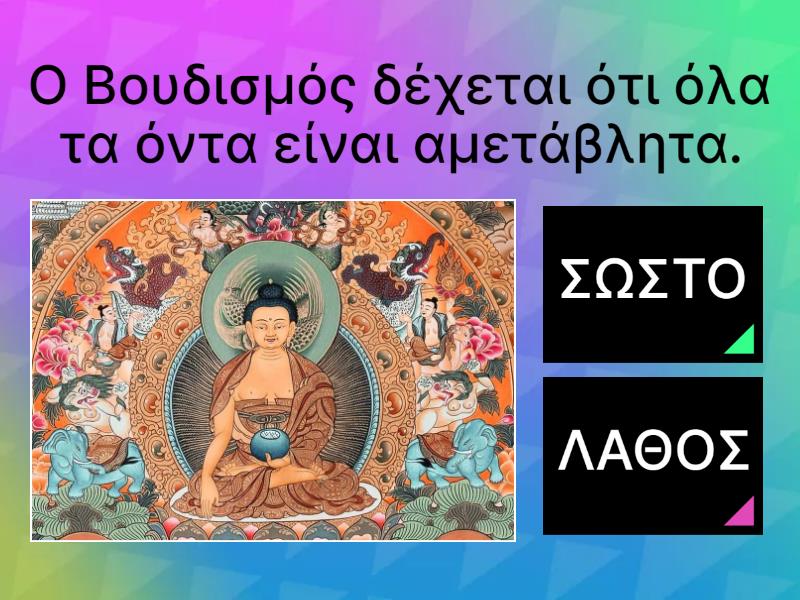 1) Ο Βουδισμός δέχεται ότι όλα τα όντα είναι αμετάβλητα. a) ΣΩΣΤΟ b) ΛΑΘΟΣ 2) Η Νιρβάνα είναι η διακοπή του κύκλου των μετενσαρκώσεων. a) ΣΩΣΤΟ b) ΛΑΘΟΣ 3) Ποιος θεωρείται ο ιδρυτής του Βουδισμού; a) Μαχάτμα Γκάντι b) Σιντάρτα Γκαουτάμα c) Λάο Τσε d) Κομφούκιος 4) Ποια είναι η βασική αιτία του πόνου σύμφωνα με τον Βουδισμό; a) Η άγνοια b) Το μίσος c) Η επιθυμία d) Η φθορά 5) Πώς ονομάζεται ο κύκλος των μετενσαρκώσεων; a) Σαμσάρα b) Κάρμα c) Μαχαγιάνα d) Ντάρμα 6) Οι τέσσερις ευγενικές αλήθειες είναι το κεντρικό δόγμα του Βουδισμού. a) ΛΑΘΟΣ b) ΣΩΣΤΟ 7) Η Νιρβάνα αποτελεί υπερβατική πραγματικότητα όπου πηγαίνει κάποιος μετά τον θάνατο. a) ΛΑΘΟΣ b) ΣΩΣΤΟ 8) Ο Μαχαγιάνα Βουδισμός εισάγει την ύπαρξη άπειρων κόσμων. a) ΣΩΣΤΟ b) ΛΑΘΟΣ 9) Τι σημαίνει Νιρβάνα στον Βουδισμό; a) Διακοπή των μετενσαρκώσεων b) Αθανασία c) Συγχώρηση των αμαρτιών d) Απόλυτη φώτιση 10) Ποιος είναι ο κύριος Βούδας του δυτικού καθαρού κόσμου; a) Σακιαμούνι b) Αμίντα c) Μαϊτρέγια d) Γκουάν-γιν