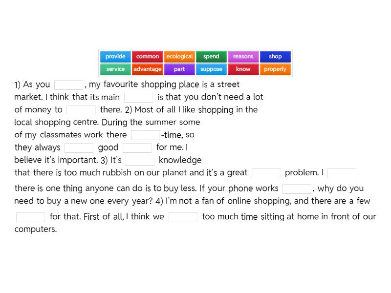 1) As you ____, my favourite shopping place is a street market. I think that its main ____ is that you don’t need a lot of money to ____ there. 2) Most of all I like shopping in the local shopping centre. During the summer some of my classmates work there ____-time, so they always ____ good ____ for me. I believe it’s important. 3) It’s ____ knowledge that there is too much rubbish on our planet and it’s a great ____ problem. I ____ there is one thing anyone can do is to buy less. If your phone works ____, why do you need to buy a new one every year? 4) I’m not a fan of online shopping, and there are a few ____ for that. First of all, I think we ____ too much time sitting at home in front of our computers. This ____ to the fact that we move less, ____ fresh air and, ____, it is bad for our health. Thus, going to ____ shops can be ____ as both: a walk and a physical exercise. 5) ____, unfortunately, I lack ____ and it’s ____ difficult for me to ____ things I see on the screen. So, it’s ____ for me to come to a shop, to ____ something I liked and to try it on if I need it. 6) My ____ day of the week is Saturday. Every Saturday I ____ my best friends in the ____ shopping centre. We start our day with a cup of coffee and a dessert in our favourite coffee shop on the ground floor. ____ we are ____ there and enjoying our drinks, we ____ through fashion blogs, websites of fashion magazines and clothes shops.