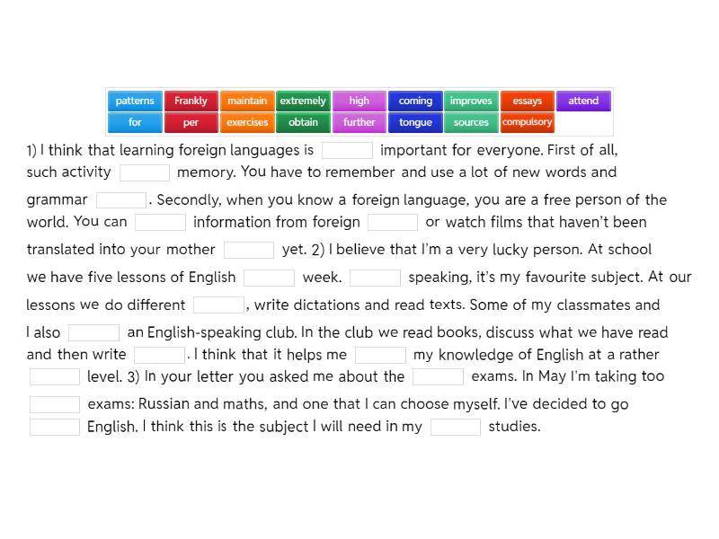 1) I think that learning foreign languages is ____ important for everyone. First of all, such activity ____ memory. You have to remember and use a lot of new words and grammar ____. Secondly, when you know a foreign language, you are a free person of the world. You can ____ information from foreign ____ or watch films that haven’t been translated into your mother ____ yet. 2) I believe that I’m a very lucky person. At school we have five lessons of English ____ week. ____ speaking, it’s my favourite subject. At our lessons we do different ____, write dictations and read texts. Some of my classmates and I also ____ an English-speaking club. In the club we read books, discuss what we have read and then write ____. I think that it helps me ____ my knowledge of English at a rather ____ level. 3) In your letter you asked me about the ____ exams. In May I’m taking too ____ exams: Russian and maths, and one that I can choose myself. I’ve decided to go ____ English. I think this is the subject I will need in my ____ studies. 4) Let me tell you a bit about my school. It’s ____ not far from my home, it takes me about 10 minutes to get there. The building itself is ____ modern, it was built about 5 years ago. We have everything that is ____ for ____ academic ____: a fully ____ IT classroom, a library, a ____ with a ____ range of dishes and, ____, a gym and a swimming pool. 5) In the summer I’m going to a language ____ at the seaside. I think it’s a great ____ to spend time at the seaside, to meet interesting people and ____ my language skills. They say we will have a speaking club with a ____-speaker. 6) My favoutirte teacher is my ____ school teacher. She is a pretty young woman, very kind and ____. I remember that she always smiled a lot, never gave us bad marks and once a week she ____ us with sweets.