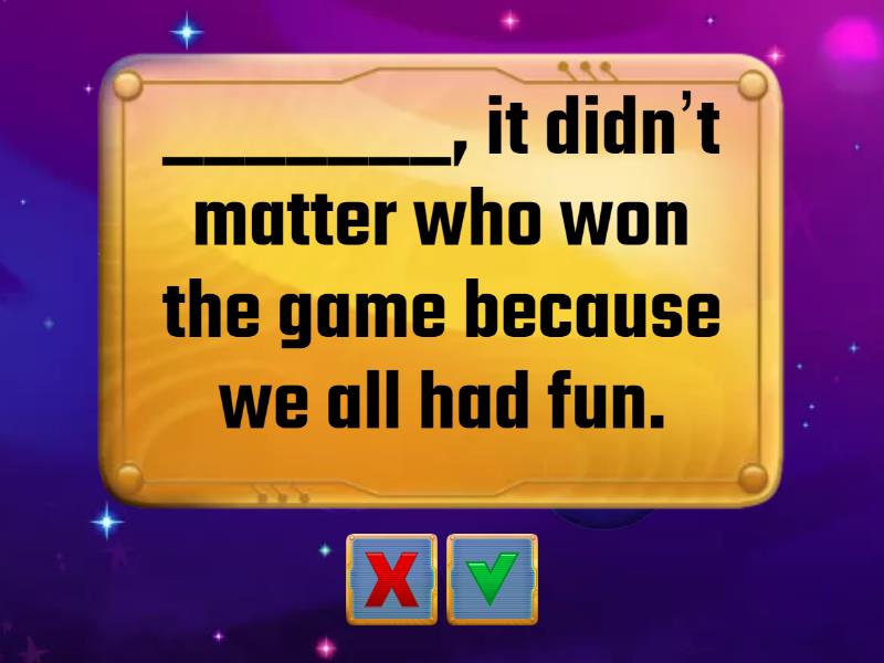 I sent the email to the wrong person ______. - by mistake, She added salt instead of sugar _______, and the cake tasted terrible. - by mistake, I learned how to play the guitar _______ by watching videos online. - on my own, He fixed the broken chair _______ without asking for help. - on his own, My boss is going to New York _______ for a week. - on business, She travels to different countries ________ quite often. - on business, _______, I found the book I had been looking for at a small bookstore. - By chance, We met _______ at the airport after not seeing each other for years. - by chance, The artist painted the portrait _______, and it looked amazing. - by hand, I prefer to make cards _______ because they feel more personal. - by hand, We argued for hours, but _______, we agreed on a solution. - in the end, _______, it didn’t matter who won the game because we all had fun. - In the end, She ignored his calls ______ because she was upset with him. - on purpose, Did you break the vase ________, or was it an accident? - on purpose, The train arrived _______, so we didn’t have to wait. - on time, If you want to catch the movie, make sure you get to the cinema _______. - on time, The teacher said she would explain the answer _______. - in a moment, I’ll join you ________ —I just need to finish this email. - in a moment, He was _________ that he left his wallet at home. - in such a hurry, I’m always ________ in the morning because I wake up late. - in a hurry,