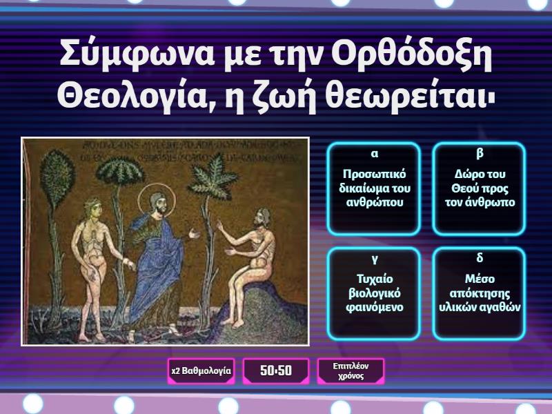 1) Σύμφωνα με την Ορθόδοξη Θεολογία, η ζωή θεωρείται: a) Προσωπικό δικαίωμα του ανθρώπου b) Δώρο του Θεού προς τον άνθρωπο c) Τυχαίο βιολογικό φαινόμενο d) Μέσο απόκτησης υλικών αγαθών 2) Ποια είναι η θέση της Ορθόδοξης Εκκλησίας για τη δωρεά οργάνων; a) Απαγορεύεται αυστηρά σε κάθε περίπτωση b) Είναι αποδεκτή μόνο για συγγενείς πρώτου βαθμού c) Ενθαρρύνεται ως πράξη αγάπης και αυτοπροσφοράς d) Επιτρέπεται μόνο εάν ο δότης είναι ανώνυμος 3) Ποια είναι η στάση της Εκκλησίας απέναντι στην ευθανασία; a) Την αποδέχεται ως δικαίωμα του ανθρώπου b) Την επιτρέπει σε περιπτώσεις αθεράπευτου πόνου c) Την θεωρεί αποδεκτή αν υπάρχει συναίνεση του ασθενούς d) Την απορρίπτει ως «ύβριν» απέναντι στον Θεό 4) Σύμφωνα με την Ορθόδοξη πίστη, ποιος έχει την εξουσία πάνω στη ζωή και τον θάνατο; a) Ο ίδιος ο άνθρωπος b) Η επιστήμη και η ιατρική c) Ο Θεός d) Η κοινωνία μέσω της νομοθεσίας 5) Ποιο είναι το κύριο επιχείρημα της Εκκλησίας ενάντια στην ευθανασία; a) Η απαγόρευση από τον ιατρικό κώδικα δεοντολογίας b) Η ανάγκη διατήρησης της τάξης στην κοινωνία c) Ο σεβασμός στο θεόσδοτο δώρο της ζωής d) Ο φόβος της κατάχρησης από τους συγγενείς 6) Σύμφωνα με την Ορθόδοξη Εκκλησία, ο θάνατος αντιμετωπίζεται ως: a) Απόλυτο τέλος της ανθρώπινης ύπαρξης b) Αποτυχία της ιατρικής επίμησης c) Κάτι που μπορεί να αποφευχθεί με την πίστη d) Μεταβατικό στάδιο προς την αιώνια ζωή 7) Η Εκκλησία θεωρεί την υπομονή στον πόνο και τις δοκιμασίες ως: a) Τρόπο εξιλέωσης b) Μάταιη ταλαιπωρία c) Σημάδι αδυναμίας d) Κατάρα που πρέπει να αποφεύγεται 8) Ποια είναι η θέση της Ορθόδοξης Εκκλησίας για την ιατρική επιστήμη; a) ην απορρίπτει ως αντίθετη στη θεία βούληση b) Τη σέβεται και την εμπιστεύεται, αλλά δεν είναι αρμόδια να αποφασίζει για τη ζωή και τον θάνατο c) Τη θεωρεί παντοδύναμη και ικανή να παρατείνει τη ζωή επ' αόριστον d) Πιστεύει ότι οι γιατροί πρέπει να ακολουθούν μόνο τις εντολές της Εκκλησίας . να αποφασίζει για τη ζωή και τον θάνατο 9) Η Εκκλησία διδάσκει ότι ο θάνατος ήρθε στον κόσμο ως συνέπεια: a) Της φυσικής φθοράς των σωμάτων b) Της αμαρτίας και της απομάκρυνσης από τον Θεό c) Της έλλειψης επιστημονικής προόδου d) Της έλλειψης προσευχής και νηστείας 10) Γιατί η Εκκλησία απορρίπτει τη «συναίνεση που εικάζεται» στη δωρεά οργάνων; a) Επειδή αντιτίθεται στις ιατρικές έρευνες b) Διότι παραβιάζει το αυτεξούσιο του ανθρώπου c) Γιατί απορρίπτει κάθε μορφή μετασχηματισμού d) Επειδή δεν είναι ξεκάθαρη νομικά