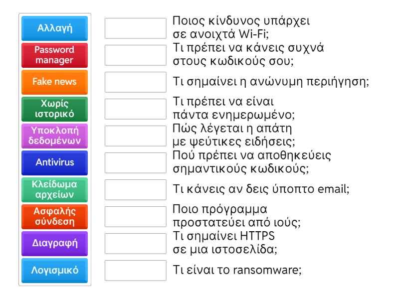 Ασφαλής σύνδεση - Τι σημαίνει HTTPS σε μια ιστοσελίδα;, Antivirus - Ποιο πρόγραμμα προστατεύει από ιούς; , Αλλαγή - Τι πρέπει να κάνεις συχνά στους κωδικούς σου;, Υποκλοπή δεδομένων - Ποιος κίνδυνος υπάρχει σε ανοιχτά Wi-Fi; , Κλείδωμα αρχείων - Τι είναι το ransomware; , Fake news - Πώς λέγεται η απάτη με ψεύτικες ειδήσεις; , Λογισμικό - Τι πρέπει να είναι πάντα ενημερωμένο; , Password manager - Πού πρέπει να αποθηκεύεις σημαντικούς κωδικούς; , Διαγραφή - Τι κάνεις αν δεις ύποπτο email; , Χωρίς ιστορικό - Τι σημαίνει η ανώνυμη περιήγηση; ,