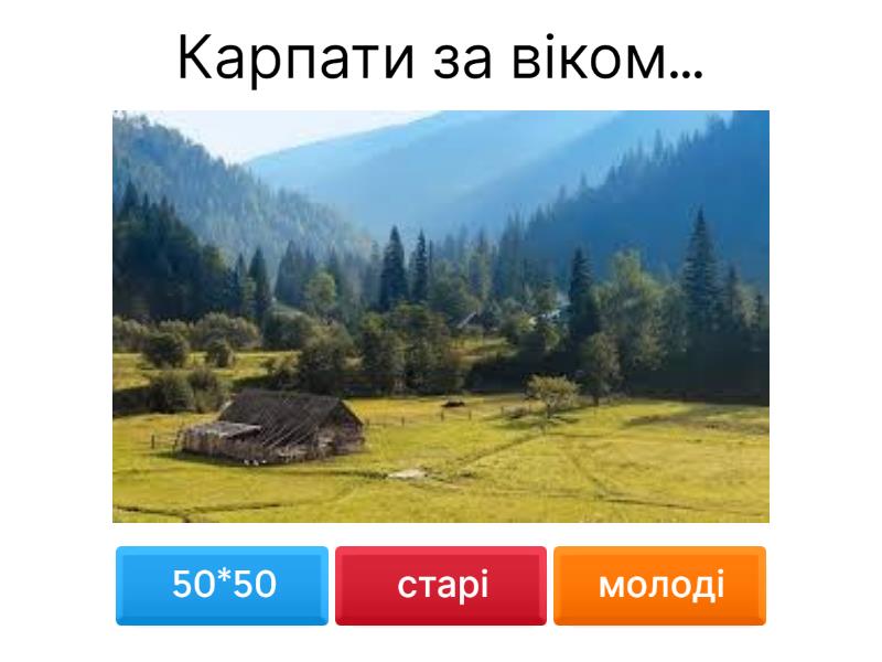 1) Карпати за віком... a) 50*50 b) старі c) молоді 2) Кримські гори за висотою... a) середні b) низькі c) високі 3) Як називають плоські вершини Кримських гір? a) ясла b) яйла c) пасмо 4) Як називають безлісі вершини Карпатських гір? a) яйла b) полонини c) пік 5) Оберіть річки Карпат a) Дніпро, Дунай, Днестр b) Лімніця, Дунай, Днестр c) Дністер, Латориця, Прут 6) Оберіть річки Кримських гір a) Дунай, Сасик, Салгір b) Салгир, Чуруксу, Ялпуг  c) Салгир, Ангара, Зуя 7) Найвища точка Кримських гір a) гора Роман-Кош b) Демір-Капу c) Зейтин-Кош 8) Найвища точка Карпат a) Піп Іван b) Говерла c) Петрос