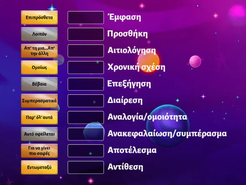 Συμπερασματικά - Ανακεφαλαίωση/συμπέρασμα, Λοιπόν - Αποτέλεσμα, Για να γίνει πιο σαφές - Επεξήγηση, Παρ' όλ' αυτά - Αντίθεση, Απ' τη μια...Απ' την άλλη - Διαίρεση, Βέβαια - Έμφαση, Εντωμεταξύ - Χρονική σχέση , Αυτό οφείλεται - Αιτιολόγηση, Επιπρόσθετα - Προσθήκη, Ομοίως - Αναλογία/ομοιότητα,
