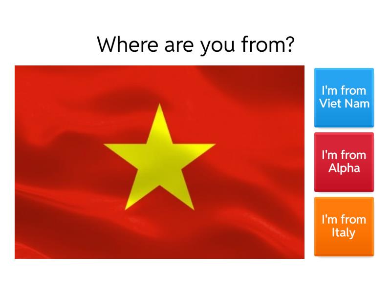 1) Where are you from? a) I'm from Viet Nam b) I'm from Alpha c) I'm from Italy 2) Where's she from? a) She's from Italy b) She's from India c) She's from Japan 3) Where's he from? a) He's from the USA b) He's from the UK c) He's from Viet Nam 4) Where are you from? a) I'm from India b) I'm from Japan c) I'm from Italy 5) Where's he from? a) He's from India b) He's from Italy c) He's from the UK 6) Where's she from? a) She's from the UK b) She's from the USA c) She's from Japan. 7) What's your name? a) IMy name's Tra My b) I'm fine, thank you. c) Good bye 8) Goodbye a) Goodbye b) Hello c) Hi 9) What color is it? a) Yellow b) Black c) Red 10) How old are you? a) I'm eight b) Hello c) Goodbye 11) It's nice to meet you. a) It's nice to meet you, too b) Ok, thank you