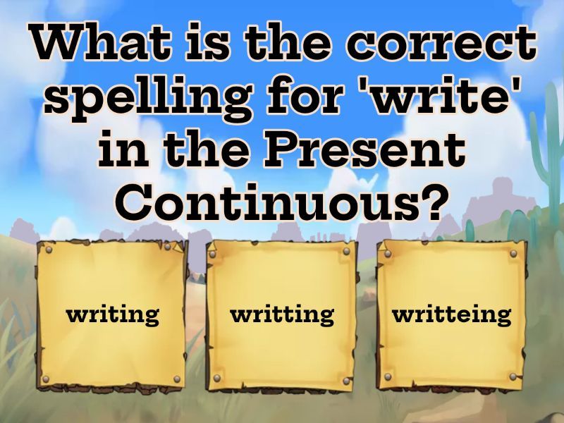 1) What is the correct spelling for 'write' in the Present Continuous? a) writing b) writting c) writteing 2) How do you form the -ING of 'lie'? a) lying b) liing c) lieng 3) What is the correct form of 'cook' in the Present Continuous? a) cooking b) cookning c) cokking 4) How do you spell 'swim' in the -ING form? a) swimming b) swimning c) swimng 5) What is the correct -ING form of 'enjoy'? a) enjoying b) enjoyingg c) enjoyingn 6) How do you form the -ING of 'put'? a) putting b) puting c) puttng 7) What is the correct spelling for 'dance' in the Present Continuous? a) dancing b) danceing c) dancig 8) How do you form the -ING of 'write'? a) writing b) writting c) writteing 9) What is the correct spelling for 'enjoy' in the -ING form? a) enjoying b) enjoyiengg c) enjoyingn 10) What is the correct form of 'play' in the Present Continuous? a) playing b) playeing c) plaiyig