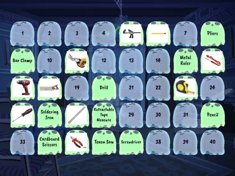 Bar Clamp, Pencil, Metal Ruler, Pliers, Cardboard Scissors, Tenon Saw, Screwdriver, Soldering Iron, Drill, Retractable Tape Measure, Caliper, Rasps, Centre Punch, Pincers, Jigsaw, Bench Vice, Claw Hammar, Hot Glue Gun, Sandpaper, Bow Saw,