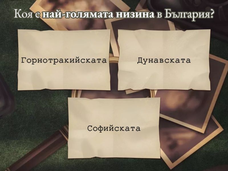 1) Коя е най-голямата низина в България? a) Горнотракийската b) Дунавската c) Софийската 2) Как се нарича източната част на Дунавската равнина, където се отглежда пшеница? a) Пирин b) Добруджа c) Горнотракийска 3) Коя е най-голямата равнина в България? a) Горнотракийска b) Софийската c) Дунавската 4) Коя река тече през Горнотракийската низина? a) Искър b) Марица c) Дунав 5) Кои градове се намират в Горнотракийската низина? a) Варна, Бургас, Шумен b) Пловдив, Стара Загора, Пазарджик c) София, Перник, Враца 6) Кое е най-голямото поле в България? a) Дунавското b) Казанлъшкото c) Софийското 7) Защо Добруджа е наречена „житницата на България“? a) Защото там растат много дървета. b) Защото там има най-много хора. c) Защото там се отглежда най-много пшеница. 8) Коя река минава през най-голямата низина в Южна България? a) Дунав b) Искър c) Марица 9) Ако видиш голяма равна местност, обградена от планини, какво е това? a) Равнина b) Низина c) Поле 10) Къде ще откриеш Добруджа? a) В западната част на Дунавската равнина. b) В източната част на Дунавската равнина. c) В южната част на Горнотракийската низина. d) В западната част на Горнотракийската низина. 11) Защо Добруджа се нарича „житницата на България“? a) Защото има много гори и реки. b) Защото там се отглежда най-много пшеница. c) Защото там има най-много градове. 12) Кои градове се намират в Горнотракийската низина? a) София, Пловдив, Враца. b) Пловдив, Стара Загора, Пазарджик. c) Варна, Бургас, Сливен. 13) Кое твърдение е вярно за равнините, низините и полетата? a) Те са най-високите места в България. b) Те са най-плодородните земи. 14) Кое твърдение е вярно само за полетата, но не и за равнините? a) Обградени са от планини. b) Намират се на север от България. c) Изобразени са в зелено.