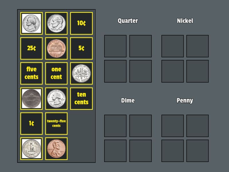 Quarter: , twenty-five cents, , 25¢, Nickel: , 5¢, , five cents, Dime: , 10¢, ten cents, , Penny: , 1¢, one cent, ,