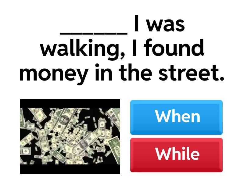 1) ______ I was walking, I found money in the street. a) When b) While 2) They _______ when she arrived.  a) were eating b) was eating c) ate 3) ______ the door bell rang, I was doing my homework. a) When b) While 4) While the teacher __________ , the students shouted.  a) was explain b) was explaining c) were explaining 5) The light went off ______ Sara was watching T.V. a) when b) while 6) ______ he was doing shopping, he lost his credit card. a) When b) While 7) Someone knocked on the door while she ________ to music. a) listening b) listen c) was listening 8) ______ the students were studying, Miss Giselle came in. a) When b) While 9) He was going out when it ________ to rain a) start b) was starting c) started 10) ______ a police officer stopped me, I was driving fast. a) While b) When 11) I was walking in the park ______ an angry dog appeared. a) when b) while 12) Danny broke his leg ______ he was playing football. a) while b) when 13) Homer was taking a shower ______ he answered a call. a) while b) when