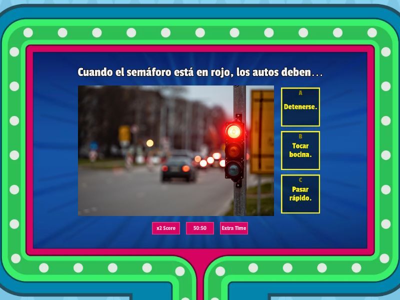 1) Cuando el semáforo está en rojo, los autos deben… a) Detenerse. b) Tocar bocina. c) Pasar rápido. 2) Cuando el semáforo esté en verde para los peatones, deben… a) Cruzar por la senda peatonal. b) Correr por cualquier lado. c) Esperar sin moverse. 3) ¿Por dónde deben cruzar las personas las calles? a) Entre los autos. b) En la esquina sin mirar. c) Por la senda peatonal. 4) Si vas en bicicleta, ¿qué debes usar para cuidarte? a) Gorro. b) Casco. c) Auriculares. 5) ¿Qué significa una señal de “Prohibido pasar”? a) Que pueden pasar solo los autos rojos. b) Que hay que ir despacio. c) Que no se puede avanzar por ahí. 6) Si una persona usa silla de ruedas, ¿qué necesita para moverse con facilidad? a) Subir a la calle. b) Rampas o veredas accesibles. c) Escaleras. 7) ¿Qué tenés que hacer antes de cruzar una calle? a) Mirar a ambos lados. b) Corregir. c) Llamar a un amigo. 8) ¿Qué medio de transporte ayuda a cuidar el ambiente? a) Bicicleta. b) Auto con motor grande. c) Camión. 9) ¿Qué deben hacer los pasajeros en un auto para cuidarse? a) Usar cinturón de seguridad. b) Jugar mientras anda. c) Pararse y mirar por la ventana. 10) ¿Qué aprendemos al respetar las normas de tránsito? a) A convivir y cuidarnos entre todos. b) A llegar más rápido. c) A tocar bocina más fuerte.