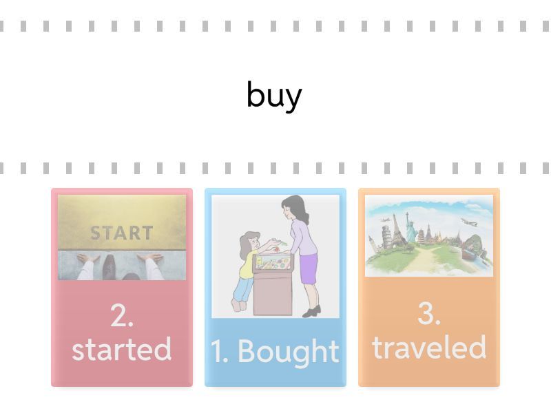 1. Bought - buy, 2. started - start, 3. traveled - travel,