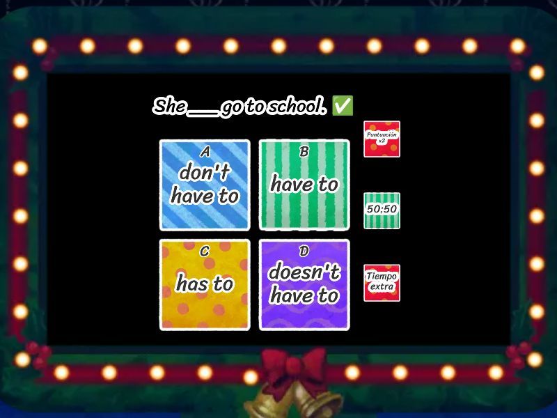 1) She ___ go to school.   ✅ a) don't have to b) have to c) has to d) doesn't have to 2) They ___ finish their homework. ✅ a) have to b) has to c) don't have to d) doesn't have to 3) He ___ clean his room. ✅ a) have to b) has to c) don't have to d) doesn't have to 4) We ___ wear uniforms. ✅ a) has to b) doesn't have to c) don't have to d) have to 5) You ___ eat vegetables. ✅ a) has to b) doesn't have to c) don't have to d) have to 6) She ___ play outside. ❌ a) has to b) doesn't have to c) don't have to d) have to 7) I ___ go to bed early. ✅ a) has to b) doesn't have to c) don't have to d) have to 8) He ___ do his chores. ✅ a) don't have to b) have to c) has to d) doesn't have to 9) They ___ bring lunch. ✅ a) have to b) has to c) don't have to d) doesn't have to 10) She ___ read every day. ✅ a) have to b) has to c) don't have to d) doesn't have to