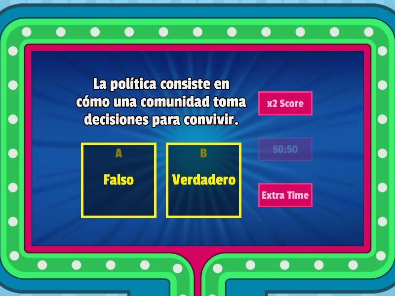 1) La política consiste en cómo una comunidad toma decisiones para convivir. a) Falso b) Verdadero 2) El acceso al poder solo se logra mediante votación democrática. a) Falso b) Verdadero 3) La autoridad es la capacidad de aplicar la política y dirigir el Estado. a) Verdadero b) Falso 4) Cuando la autoridad no es aceptada, no ocurre nada en la sociedad. a) Verdadero b) Falso 5) El Estado es una entidad política estable, soberana e independiente. a) Falso b) Verdadero 6) Nación y país son conceptos idénticos según el texto. a) Verdadero b) Falso 7) La soberanía es la autoridad que ejerce el Estado. a) Verdadero b) Falso 8) El Estado no tiene funciones relacionadas con la redistribución de la riqueza. a) Falso b) Verdadero 9) En una democracia existe separación de poderes. a) Falso b) Verdadero 10) En los sistemas autoritarios se garantiza el sufragio universal. a) Verdadero b) Falso 11) En una monarquía, la jefatura del Estado es hereditaria. a) Falso b) Verdadero 12) En una república, el jefe del Estado es elegido por votación. a) Verdadero b) Falso 13) Un Estado federal concede amplia autonomía a sus territorios. a) Falso b) Verdadero 14) Un Estado liberal controla todos los aspectos económicos. a) Verdadero b) Falso 15) El sufragio censitario permite votar a todas las personas mayores de edad. a) Verdadero b) Falso 16) La Constitución es la ley fundamental de un país. a) Falso b) Verdadero 17) El poder legislativo aplica las leyes. a) Falso b) Verdadero 18) El poder judicial interpreta y hace cumplir las leyes. a) Falso b) Verdadero 19) Un Estado laico reconoce una religión oficial. a) Falso b) Verdadero 20) En una dictadura se limitan derechos y libertades. a) Falso b) Verdadero