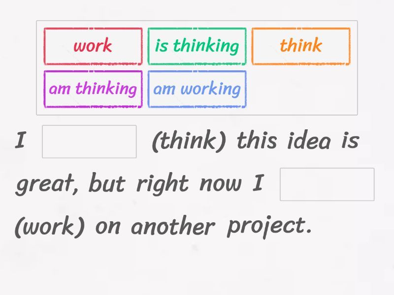 I ____ (think) this idea is great, but right now I ____ (work) on another project. She prefer ____ (prefer) to stay home on weekends, but today she ____ (visit) her friends. They ____ (understand) the task, but they ____ (try) to finish it faster. Mark ____ (own) three laptops, but he ____ (look) for a new one at the moment. I ____ (hear) someone outside, can you check what ____ (happen)? Julia ____ (hate) cold weather, so this winter she ____ (plan) to travel south. We ____ (believe) this course is useful, and we ____ (learn) a lot right now. He ____ (like) this restaurant, but today he ____ (cook) at home. The soup ____ (taste) strange. I think you have added too much salt. I ____ (see) what you mean, but I ____ (not agree) with your decision.
