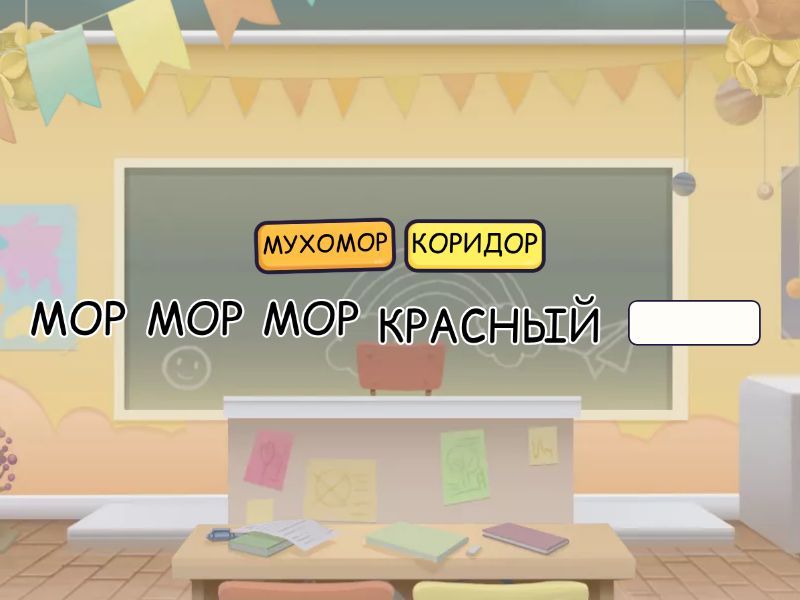 МОР МОР МОР КРАСНЫЙ ____ ВЁР ВЁР ВЁР В КОМНАТЕ ____ РОГА РОГА РОГА РОВНАЯ ____ РУЗА РУЗА РУЗА В ПОЛЕ ____ МАР МАР МАР НАЗОВУ ____ РОХ РОХ РОХ НАЗОВУ ____ РАД РАД РАД СЛАДКИЙ ____