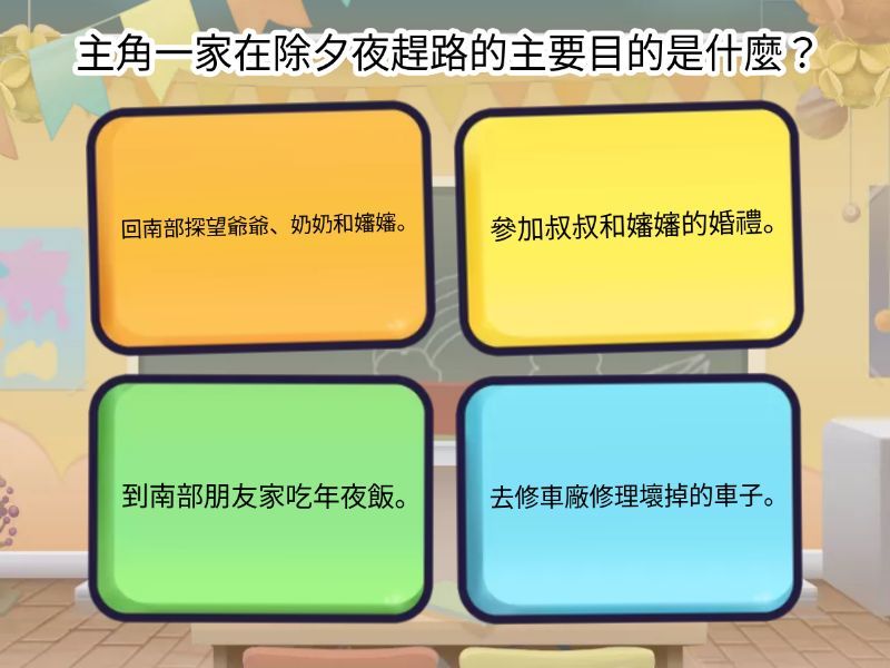 1) 主角一家在除夕夜趕路的主要目的是什麼? a) 回南部探望爺爺、奶奶和嬸嬸。 b) 參加叔叔和嬸嬸的婚禮。 c) 到南部朋友家吃年夜飯。 d) 去修車廠修理壞掉的車子。 2) 在回家的路上,主角一家的車子遇到了什麼突發狀況? a) 車子因為下大雨而打滑。 b) 車子在路上沒有汽油了。 c) 車子發出奇怪的聲音後故障了。 d) 車子的輪胎爆胎了。 3) 當車子在除夕夜故障時,他們是如何找到人幫忙的? a) 他們向路邊放煙火的人求助。 b) 爺爺開車來接他們。 c) 媽媽看到一家正要關門的修車廠。 d) 爸爸打電話給道路救援服務。 4) 關於修車師傅一家人,下列哪項描述最符合故事內容? a) 他們只願意幫忙檢查,不願意修理車子。 b) 他們因為是除夕夜,所以收取了很高的修理費。 c) 他們抱怨主角一家打擾了他們的年夜飯。 d) 他們很熱心,認為幫助主角一家回家團圓很重要。 5) 為什麼主角一家最後沒有親自去探望嬸嬸? a) 因為修車耽誤太久,到爺爺家時已經太晚了。 b) 因為嬸嬸剛生完小堂妹,正在月子中心休養。 c) 因為嬸嬸和叔叔出國旅行了。 d) 因為下大雨,所以不方便出門。 6) 主角一家是如何與叔叔和嬸嬸團圓的? a) 透過平板電腦進行視訊通話。 b) 透過打電話聽聽他們的聲音。 c) 觀看叔叔預錄的拜年影片。 d) 等到第二天早上才去月子中心看他們。 7) 在視訊畫面中,主角一家看到了哪位新的家庭成員? a) 叔叔和嬸嬸剛出生的小堂妹。 b) 嬸嬸的父母。 c) 爺爺和奶奶新養的小狗。 d) 從國外回來的大伯。 8) 叔叔說的「家人在哪裡,家就在那裡」這句話,最能表達什麼含意? a) 他們計畫要搬到叔叔和嬸嬸住的城市。 b) 叔叔覺得無法親自見面很遺憾。 c) 只有在爺爺奶奶家才算是真正的家。 d) 真正的團圓在於家人的心是否在一起,而不在於形式。 9) 在修好車子繼續上路後,當時的天氣和路況如何? a) 天氣晴朗,但路上交通非常擁擠。 b) 起了濃霧,讓爸爸開車變得很困難。 c) 路上結冰,所以車速非常緩慢。 d) 正在下雨,路上幾乎沒有別的車。 10) 爸爸說了什麼話,把全家人都逗笑了? a) 他模仿車子壞掉時發出的聲音。 b) 他稱讚修車師傅的技術非常好。 c) 他開玩笑說,本來還想全家跑步回來。 d) 他抱怨除夕夜還在路上奔波。