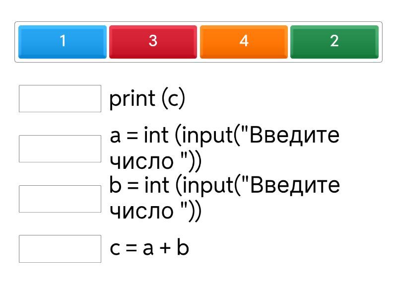 1 - a = int (input("Введите число ")), 2 - b = int (input("Введите число ")), 3 - c = a + b, 4 - print (c),