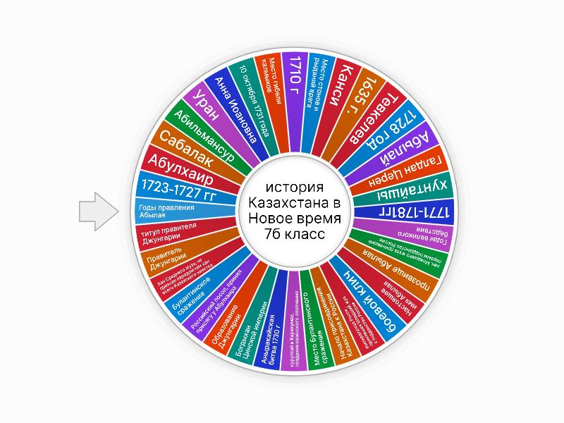 1) 1723-1727 гг 2) Абулхаир 3) Сабалак 4) Абильмансур 5) Уран 6) Анна Иоановна 7) 10 октября 1731 года 8) Место гибели калмыков 9) 1710 г 10) Место стонов и рыданий врага 11) Канси 12) 1635 г. 13) Тевкелев 14) 1728 год 15) Абылай 16) Галдан Церен 17) хунтайшы 18) 1771-1781гг 19) Годы великого бедствия 20) хан, Младшего жуза принявший первым подданство России 21) прозвище Абылая 22) Настоящее имя Абылая 23) боевой клич 24) Императрица Росси , принявшая Младший жуз в подданство России 25) Начало присоединения Казахстана к России 26) Место Булантинского сражения 27) курултай в Каракумах, создание казахского ополчения 28) Аныракайская битва 1730 г 29) Богдыхан Цинской империи 30) Образование Джунгарии 31) Российский посол, принял присягу у Абулхаира 32) Булантинское сражение 33) Хан Среднего жуза, но признан народом как хан всего Казахского ханства 34) Правитель Джунгарии 35) титул правителя Джунгарии 36) Годы правления Абылая