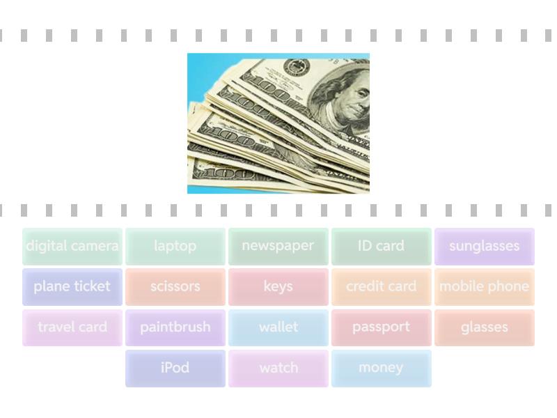 money, passport, credit card, ID card, travel card, plane ticket, digital camera, glasses, sunglasses, wallet, keys, mobile phone, newspaper, watch, iPod, laptop, scissors, paintbrush,