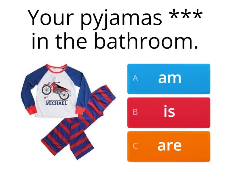 1) Your pyjamas *** in the bathroom. a) am b) is c) are 2) The pyjamas *** too big for her. a) is b) are 3) There *** a white trainer under the bench. a) is b) are 4) Jeans *** always in fashion. a) is b) are 5) One sandal *** here, where is the other one? a) is b) are 6) His shorts *** really fashionable. a) is b) are 7) Where *** my NIKE leggings? a) is b) are 8) There *** a lot of clothes in my wardrobe. a) is b) are 9) There *** two different socks in my backpack. a) is b) are 10) I wonder where the other black shoe ***. a) is b) are 11) Don't you think that these shorts *** too short?  a) is b) are 12) These scarves *** so beautiful! Where did you buy ***? a) is / it b) are / them 13) Where *** your old trainers? - I threw *** away. a) is / it b) are / them 14) *** mittens is very warm.  a) This / is b) These / are 15) I like *** sandals, show *** to me, please. a) this / it b) these / them 16) Where *** your old jeans? a) is b) are 17) *** pyjamas *** soft and comfortable. a) This / is b) These / are 18) Mother's gloves *** really beautiful. I's like to wear *** as well. a) is / it b) are / them 19) Where *** your black sweater? - I'm going to wash *** together with your leggings and T/shirts. a) are / them b) is / it 20) Shorts *** not for winter, aren't they? a) are b) is