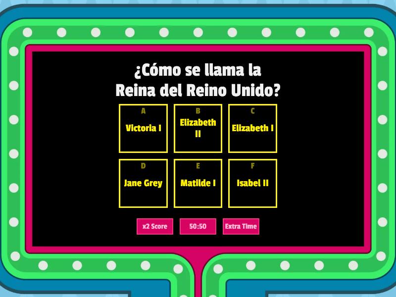 1) ¿Cómo se llama la Reina del Reino Unido? a) Victoria I b) Elizabeth II c) Elizabeth I d) Jane Grey e) Matilde I f) Isabel II 2) ¿Cuál es el río más largo del mundo? a) Nilo b) Amazonas c) Misisipi d) Yangtsé e) Yeniséi f) Obi 3) ¿Qué cantidad de huesos en el cuerpo humano? a) 206 b) 106 c) 300 d) 284 e) 176 f) 223 4) ¿Cuál es el disco más vendido de la historia? a) El Guardaespaldas (BSO) b) The Eagles: Their Greatest Hits c) Led Zeppelin IV de Led Zeppelin d) Back in Black de ACDC e) Thriller de Michael Jackson f) The Dark Side of the Moon de Pink Floyd 5) ¿Cuál es el país más grande del mundo? a) Canadá b) Antártida c) Rusia d) China e) Estados Unidos f) Brasil 6) ¿Quién es el autor de el Quijote? a) Pablo Neruda b) Gabriel García Márquez c) Juan Carlos Onetti d) Miguel de Cervantes e) Miguel Asturias f) Carlos Fuentes 7) ¿Quién pintó “la última cena”? a) PAUL CÉZANNE b) VINCENT VAN GOGH c) JMW TURNER d) MIGUEL ÁNGEL e) LEONARDO DA VINCI f) ARTEMISIA GENTILESCHI 8) ¿Cuál es el océano más grande? a) El Océano Ártico b) El Océano Índico c) El Océano Pacífico d) El Océano Atlántico e) El Océano Antártico f) El Océano Atlántico Norte 9) ¿Quién es el padre de la psicología? a) William James b) Jean Piaget c) Wilhelm Wundt d) Lev Vygotsky e) Abraham Maslow f) Sigmund Freud 10) ¿Qué producto cultiva más Guatemala? a) Café b) Caña de azúcar c) Maíz d) Zanahorias e) Tomates  f) Mangos 11) ¿Cuál es el segundo planeta en el sistema solar? a) Mercurio b) Venus c) Tierra d) Marte e) Júpiter f) Saturno  12) ¿Cuál es país más poblado de la Tierra? a) Nigeria b) Estados Unidos c) Indonesia d) Pakistán e) India f) China 13) ¿Cuál es el color que representa la esperanza? a) Rojo b) Verde c) Amarillo d) Azul e) Blanco f) Negro 14) ¿Cuántas patas tiene la araña? a) 14 b) 4 c) 12 d) 8 e) 10 f) 6 15) ¿Cómo se llama el animal más rápido del mundo? a) Guepardo b) Gacela Thomson c) Tigre Siberiano d) Ardilla de las Carolinas e) Berrendo f) Canguro gris oriental 16) ¿Cuál fue el primer metal que empleó el hombre? a) Hierro b) Cobre c) Cobalto d) Níquel e) Plomo f) Cadmio 17) El triángulo que tiene sus tres lados iguales ¿Cómo se llama? a) Triángulo isósceles b) Triángulo rectángulo c) Triángulo escaleno d) Triángulo acutángulo e) Triángulo obtusángulo f) Triángulo equilátero 18) ¿Cuántos años tiene un lustro? a) 2 años b) 5 años c) 6 años d) 20 años e) 25 años f) 50 años  19) ¿Cuántos corazones tienen los pulpos? a) 5 b) 2 c) 1 d) 3 e) 4 f) 8 20) ¿En qué año murió Steve Jobs? a) 2008 b) 2010 c) 2011 d) 2007 e) 2012 f) 2009