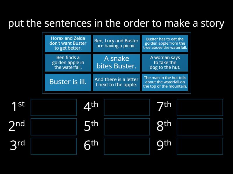 Ben, Lucy and Buster are having a picnic., A snake bites Buster., Buster is ill., A woman says to take the dog to the hut., The man in the hut tells about the waterfall on the top of the mountain., Buster has to eat the golden apple from the tree above the waterfall., Horax and Zelda don't want Buster to get better., Ben finds a golden apple in the waterfall., And there is a letter I next to the apple..