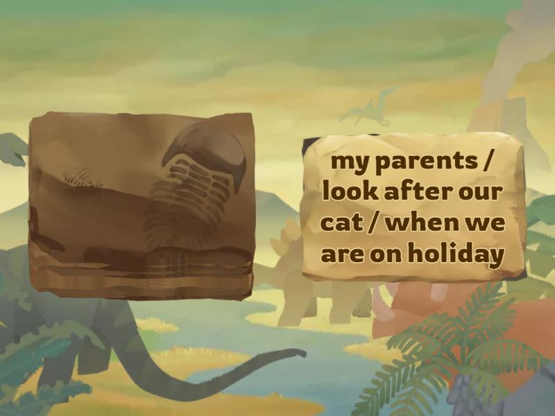 try on clothes / when I go shopping, should / give up a bad habit, look forward to the next vacation, throw away old clothes, put on new jeans / immediately after I buy them, set off for work early in the morning, eat out in a restaurant / every weekend, look for a new job / in the future, turn on the radio in a car / in the morning, turn off the TV / when I come home from work, go away to the countryside / this weekend, get up early in the morning, my parents / look after our cat / when we are on holiday, take off the shoes in the flat.