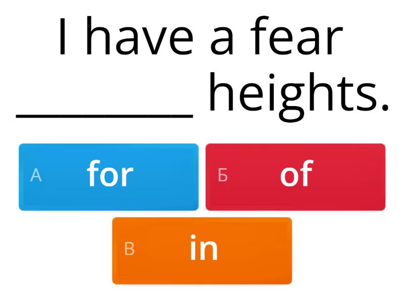 1) I don't have access _____ that information. a) to b) at c) in 2) Do you have the address _____ that company? a) by b) of c) in 3) We've put an advertisement ____ that job online. a) to b) at c) for 4) Almonds and grapes are a healthy alternative ____ sweets. a) in b) for c) to 5) It's an interesting approach ______ learning poems. a) to b) for c) in 6) Helen's a good influence _____ him. a) at b) on c) of 7) Building a border wall is an attack _______ personal liberties. a) to b) at c) on 8) It’s important to have a positive attitude _______ work. a) to b) at c) on 9) We’re trying to raise people’s awareness _____ the crisis. a) in b) of c) at 10) The government have brought in a ban _________ fossil fuels. a) for b) at c) on 11) I still have great belief _______ my own abilities. a) in b) at c) for 12) Congratulations ______ passing the exam. a) at b) on c) in 13) I’d like to do a course ______ computer programming. a) in b) at c) of 14) Scientists are looking for a cure _______ the virus. a) of b) for c) at 15) The storm caused extensive damage _______ the property. a) to b) at c) for 16) There isn’t much demand ______ the product these days. a) in b) for c) at 17) We apologize for the delay _____ processing your order. a) for b) at c) in 18) What’s the difference ______ them? a) in b) of c) at 19) It’s having a negative effect ____ all of us. a) for b) on c) at 20) My boss puts an emphasis _______ punctuality. a) at b) for c) on 21) This is the exception _____ the rule. a) to b) for c) in 22) Do you have any experience _______ the field of marketing.? a) at b) of c) in 23) Do you still have faith _______ me? a) in b) of c) for 24) I have a fear ________ heights. a) for b) of c) in 25) Global warming is having a huge impact _________ ecosystems. a) on b) for c) at 26) The weather was a minor inconvenience ______ our plans. a) to b) at c) in 27) I’ve got a keen interest ____ sociology. a) for b) in c) at 28) What’s the key ________ learning phrasal verbs? a) to b) for c) in 29) She’s got a great knowledge _____ Russian history. a) at b) of c) in 30) A lack ____ effort is why we failed. a) of b) in c) for 31) Does anyone have any objection ____ the proposal? a) for b) to c) in 32) Is there a possibility ____ finding work there? a) of b) in c) for 33) We take pride _____ what we do. a) at b) for c) in 34) Jo was suprised by her reaction ___ the news. a) to b) for c) at 35) There’s no reason ______ that kind of attitude. a) of b) for c) in