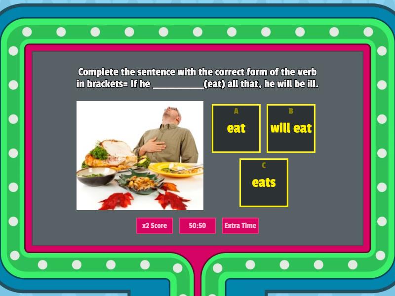 1) If I finish my homework, I _______________ to the party. (go) a) could go b) will go c) went d) got 2) What is the structure of zero conditional? a) If + present, + will b) If + present, + past c) If + present, + present 3) In which conditional is the following sentence written?= If public transport is efficient, people stop using their cars.  a) Zero conditional b) First conditional 4) He will pass the test if he............................ a) buys an ice-cream. b) don't waste time. c) study for it. d) studies a lot. 5) Which phrase best describes the image? a) If you call me, I will answer. b) If Sara pays her cellphone receipt, she will call me. c) He will call me if I asked him. 6) The structure of the first conditional is... a) If+ present, +present b) If+ present,+ would c) If+ present,+ will d) if +past....will 7) What statement is always true (zero conditional)?  a) If it rains, I won't go out. b) An ice cube melts if you put it in the sun. c) If she sleeps bad, she rests. 8) If I see him, I _____________ (give) him a lift. a) will give b) give c) gave 9) Complete the sentence with the correct form of the verb in brackets= If he ___________(eat) all that, he will be ill. a) eat b) will eat c) eats 10) Complete the sentence with the correct form of the verb in brackets= When people ________ (eat) too many sweets, they ________ (get) fat. a) eat / get b) eat / will get c) will eat / get