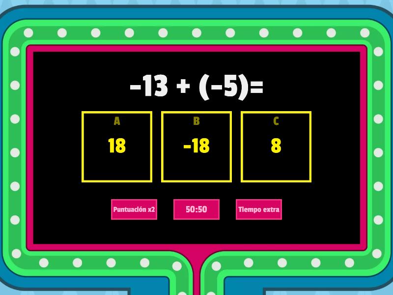 1) -13 + (-5)= a) 18 b) -18 c) 8 2) 15 - 20 = a) -5 b) 5 c) 35 3) 12 - (-18) = a) -6 b) 30 c) -30 4) (-8) + -2 = a) -6 b) -10 c) 6 5) -5 + 20 - (-10)= a) 25 b) -25 c) 15 6) -17 - 4 = a) 13 b) 21 c) -21 7) -12 + (-3) + 7 = a) 8 b) -8 c) 9 8) -8 - (-9) = a) 1 b) -1 c) 17 9) -3 - (-31) + 1= a) 27 b) -35 c) 29 10) (-8 )+ (-7) = a) -15 b) 15 c) -1 11) (-12) + (-17) + 21 = a) 26 b) -8 c) -16 12) (–34) + (–12) + 0 = a) 46 b) -22 c) -46 13) 55 + 65 – 120 = a) -55 b) 0 c) -0 14) -84 + -2 = a) -86 b) 86 c) -82 15) -12 + 40 - (-5) = a) -34 b) -33 c) 32 16) (-22) + (-35) + (9) a) 48 b) -48 c) 66 17) 24 + (- 30) a) 8 b) 54 c) -6 18) 10,04 + 5,2 + 1 a) 15,15 b) 16,24 c) 15,25 19) -3,24 + 1,8 a) 5,04 b) 4,32 c) -1,44