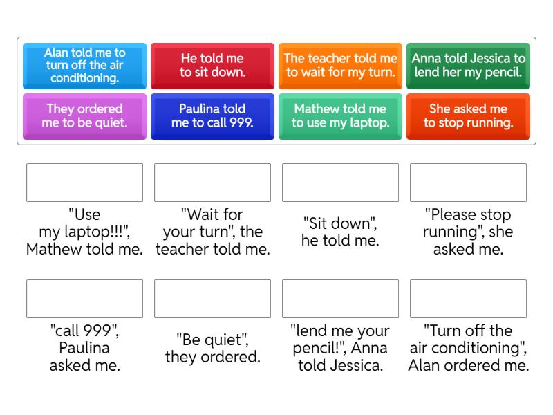 He told me to sit down. - "Sit down", he told me., She asked me to stop running. - "Please stop running", she asked me., They ordered me to be quiet. - "Be quiet", they ordered., Anna told Jessica to lend her my pencil.  - "lend me your pencil!", Anna told Jessica., The teacher told me to wait for my turn.  - "Wait for your turn", the teacher told me., Alan told me to turn off the air conditioning.  - "Turn off the air conditioning", Alan ordered me., Mathew told me to use my laptop. - "Use my laptop!!!", Mathew told me., Paulina told me to call 999. - "call 999", Paulina asked me.,